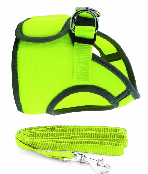 Мягкая и удобная шлейка-жилетка с поводком - функциональный аксессуар для четвероногих модников. Шлейка выполнена из высококачественного нейлона и имеет дышащую сетчатую поверхность, которая бережно прилегает к телу животного и хорошо пропускает воздух. Шлейка крепится при помощи широкой липучки и удобной пластиковой застежки на спине питомца. неоновая желтая цвет и вставки из светоотражающего материала делают питомца заметным в любых условиях. Изделие подходит для кошек и собак мелких пород.